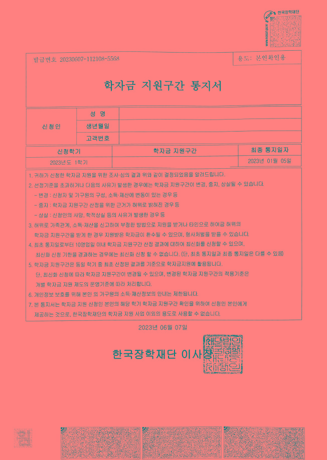 ※학자금 지원구간 통지서는 한국장학재단 국가장학금 신청을 통해 발급 가능