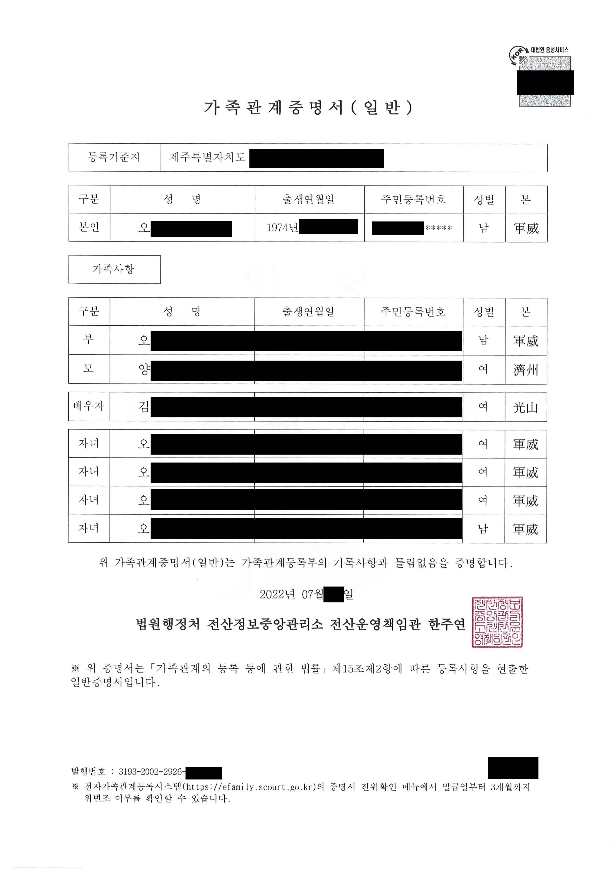 가족관계 증명서 (※부모 (정보제공 동의서) 기준으로 발급) |
