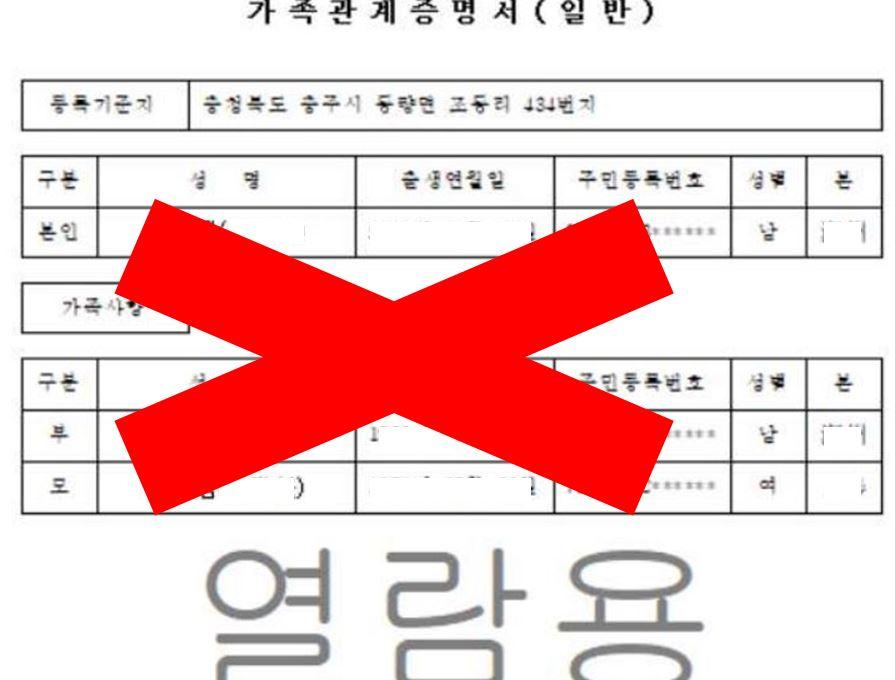 [미인정 서류 주요사례] 주민등록표(등본, 초본), 증명서 컴퓨터 확인화면 등 열람용으로 발행된 증명서, 발급일, 직인날인 없는 것