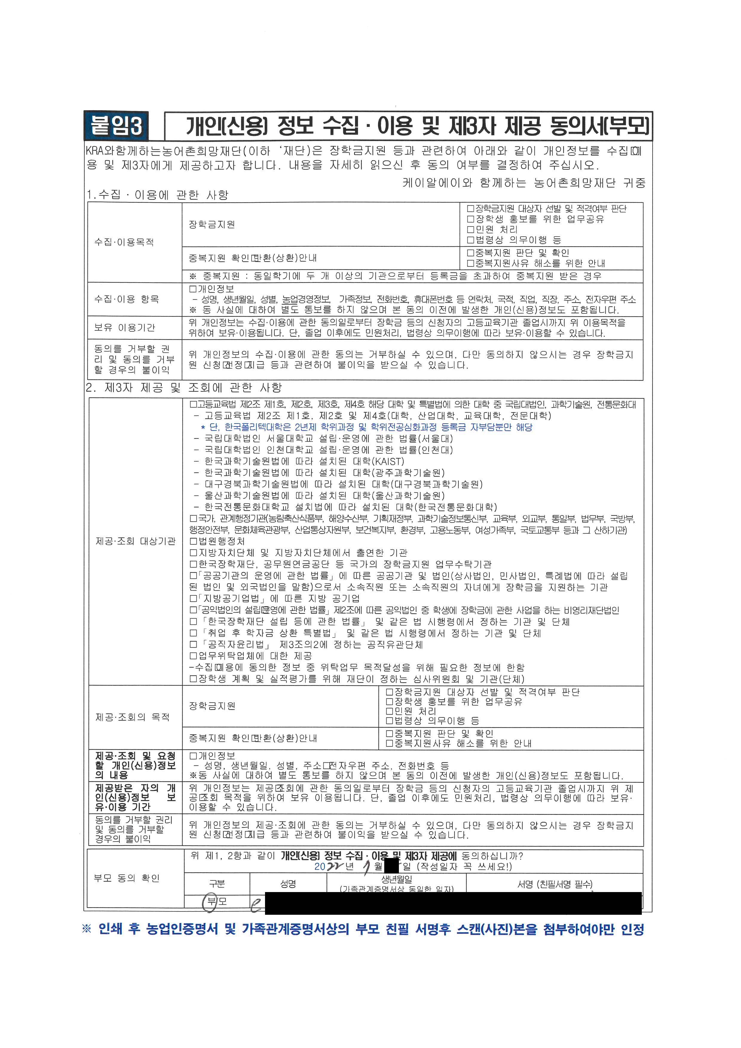 KRA와 함께하는 농어촌희망재단(이하 ‘재단’)은 장학금지원 등과 관련하여 아래와 같이 개인정보를 수집․이용 및 제3자에게 제공하고자 합니다. 내용을 자세히 읽으신 후 동의 여부를 결정하여 주십시오.