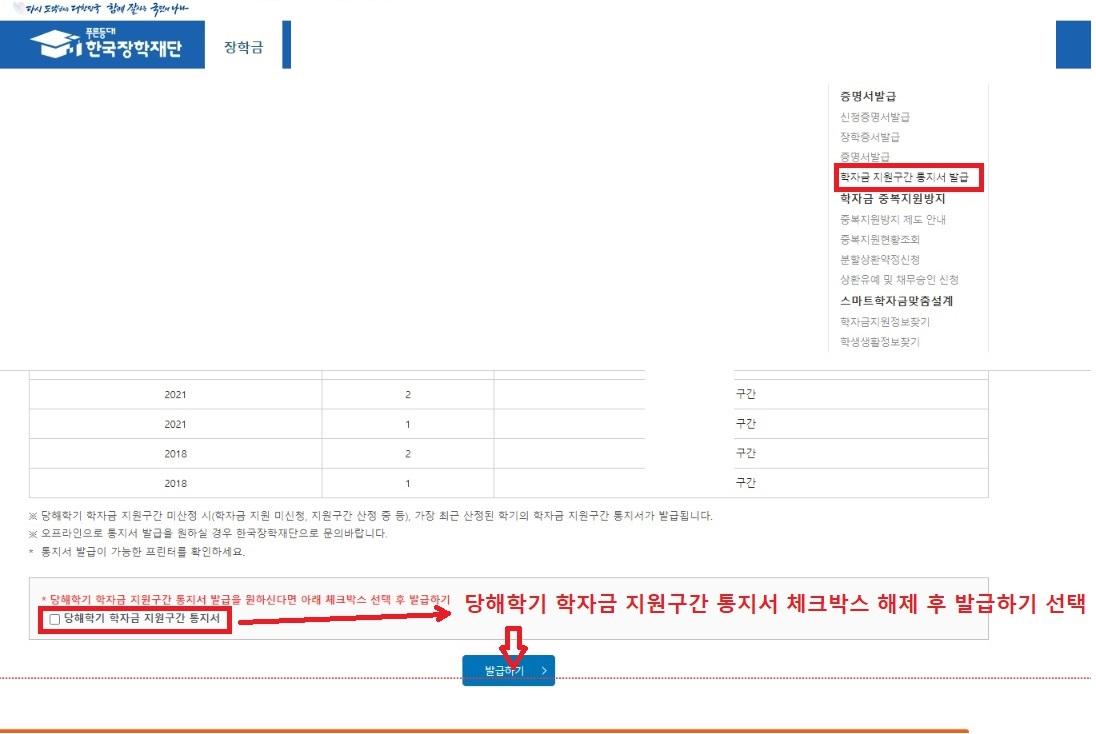 한국장학재단(www.kosaf.go.kr) 장학금→증명서발급→학자금 지원구간 통지서 발급 |