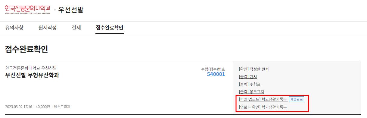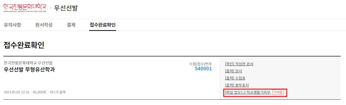▶ 내원서보관함 > 접수원서 > 출력물 목록> [우선선발(입학고사)]생활기록부 업로드